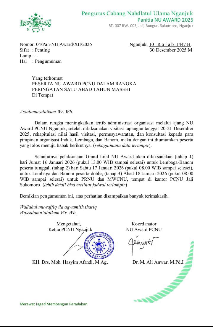 Pengurus Cabang Nahdlatul Ulama (PCNU) Kabupaten Nganjuk secara resmi mengumumkan peserta yang lolos menuju babak Grand Final NU Award PCNU Nganjuk dalam rangka Peringatan Satu Abad Tahun Masehi. Pengumuman ini disampaikan setelah melalui rangkaian visitasi lapangan yang dilaksanakan pada tanggal 20–21 Desember 2025.