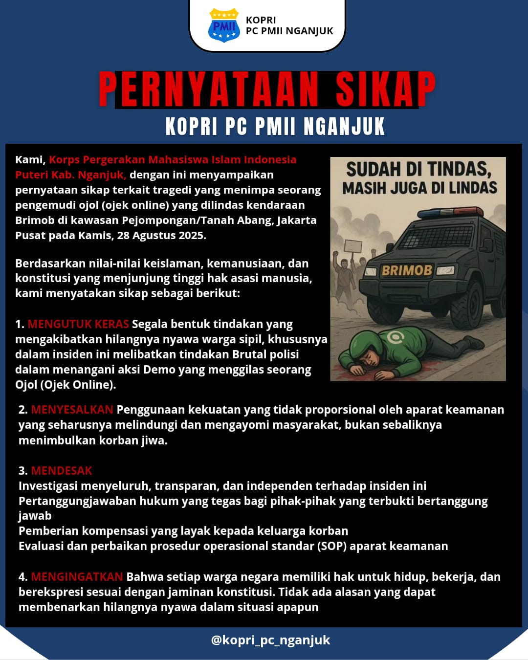 Korps Pergerakan Mahasiswa Islam Indonesia Puteri (KOPRI) PC PMII Nganjuk menyampaikan pernyataan sikap keras atas insiden tragis yang menimpa seorang pengemudi ojek online, Affan Kurniawan, yang tewas setelah terlindas kendaraan taktis milik Brimob di kawasan Pejompongan/Tanah Abang, Jakarta Pusat, Kamis 28 Agustus 2025.